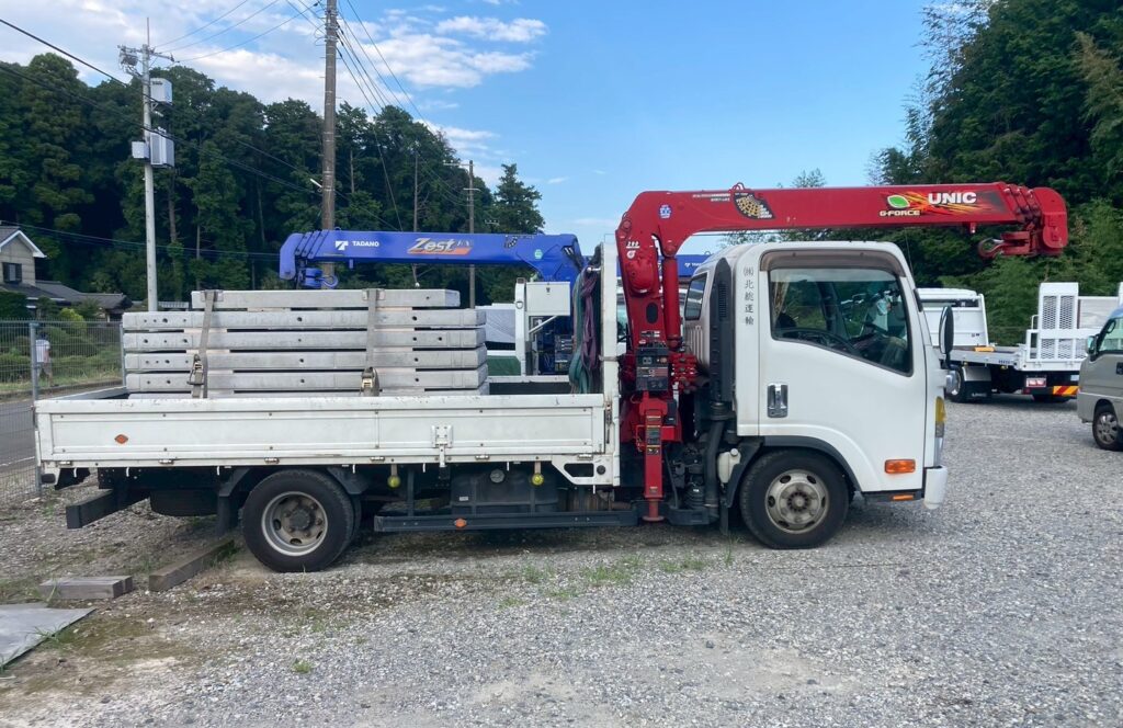 3t積載のユニック車は、小回りが利きつつもクレーンによる荷役が可能なため、住宅密集地や狭い現場での資材搬入に最適です。